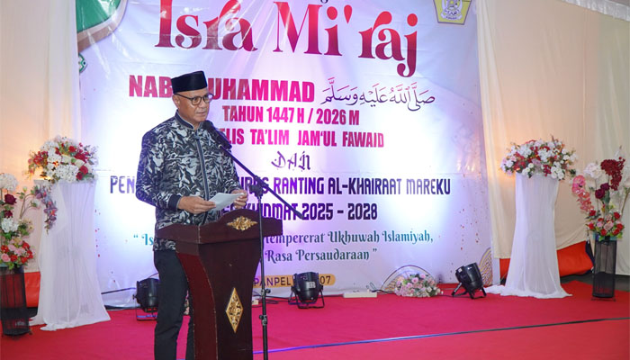 Siarmalut – Wali Kota Tidore Kepulauan Muhammad Sinen menghadiri Acara Peringatan Isra Mi’raj Nabi Muhammad SAW 1447 H/2026 M yang dirangkaikan dengan Pengukuhan Pengurus Ranting Alkhairaat Mareku Masa Khidmat 2025-2028 diselenggarakan oleh Majelis Ta’lim Jam’ul Fawaid Kelurahan Mareku, Rabu (21/1/2026) Malam.